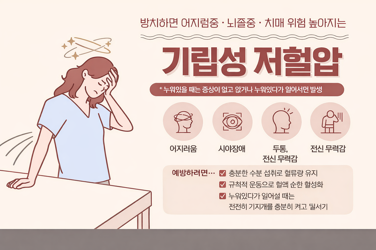 기립성 저혈압은 특히 “왜 나는 이렇게 자주 어지럽지?”라는 답답함이 큰 질환입니다.
